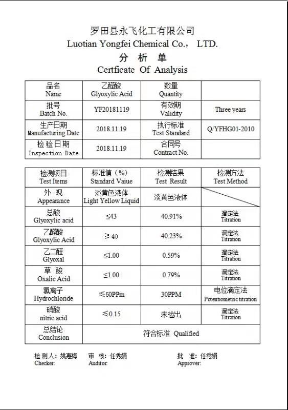 ITEMS SPECIFICATION Appearance@25℃ Light Yellow Liquid Glyoxylic acid No more than 43 Glyoxylic Acid No less than 40 Glyoxal No more than 1.00 Oxalic Acid No more than 1.0 Hydeochloride No more than 50ppm Nitric Acid No more than 0.15 -